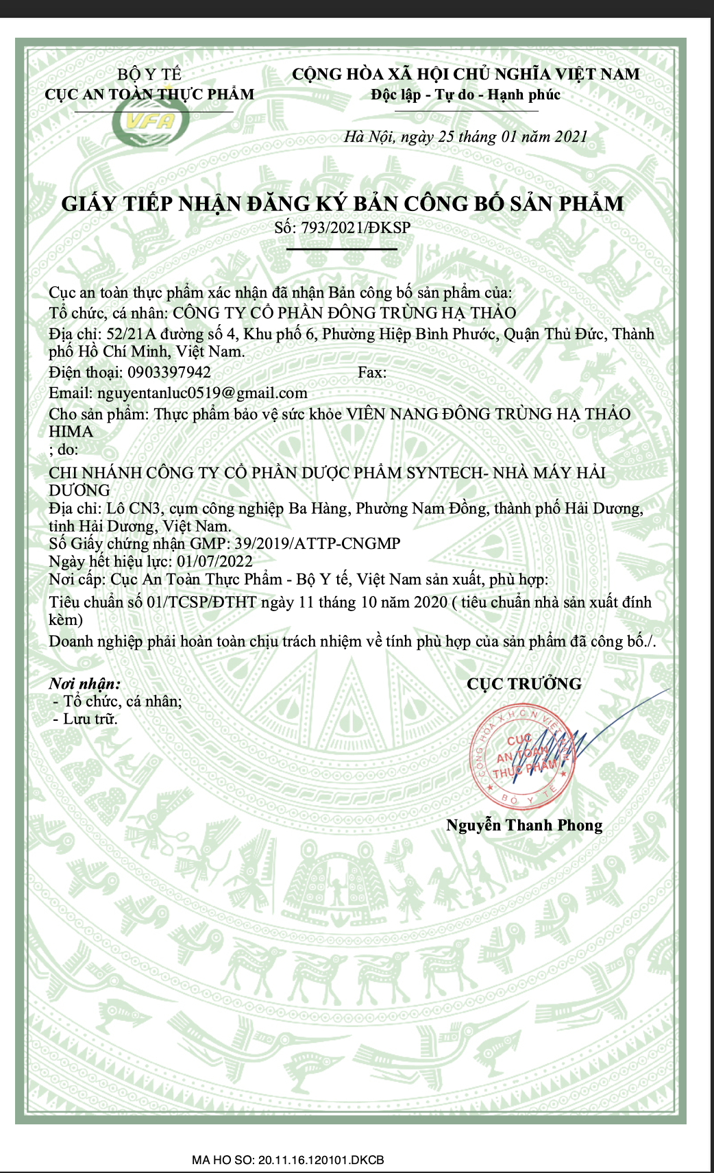 - Giấy tiếp nhận đăng ký bản công bố sản phẩm: Mỗi sản phẩm do Khai Hoan Holding cung cấp đều đã được Cục An toàn Thực phẩm thẩm định và cấp giấy chứng nhận, đảm bảo về nguồn gốc, thành phần, công dụng và an toàn cho người sử dụng.